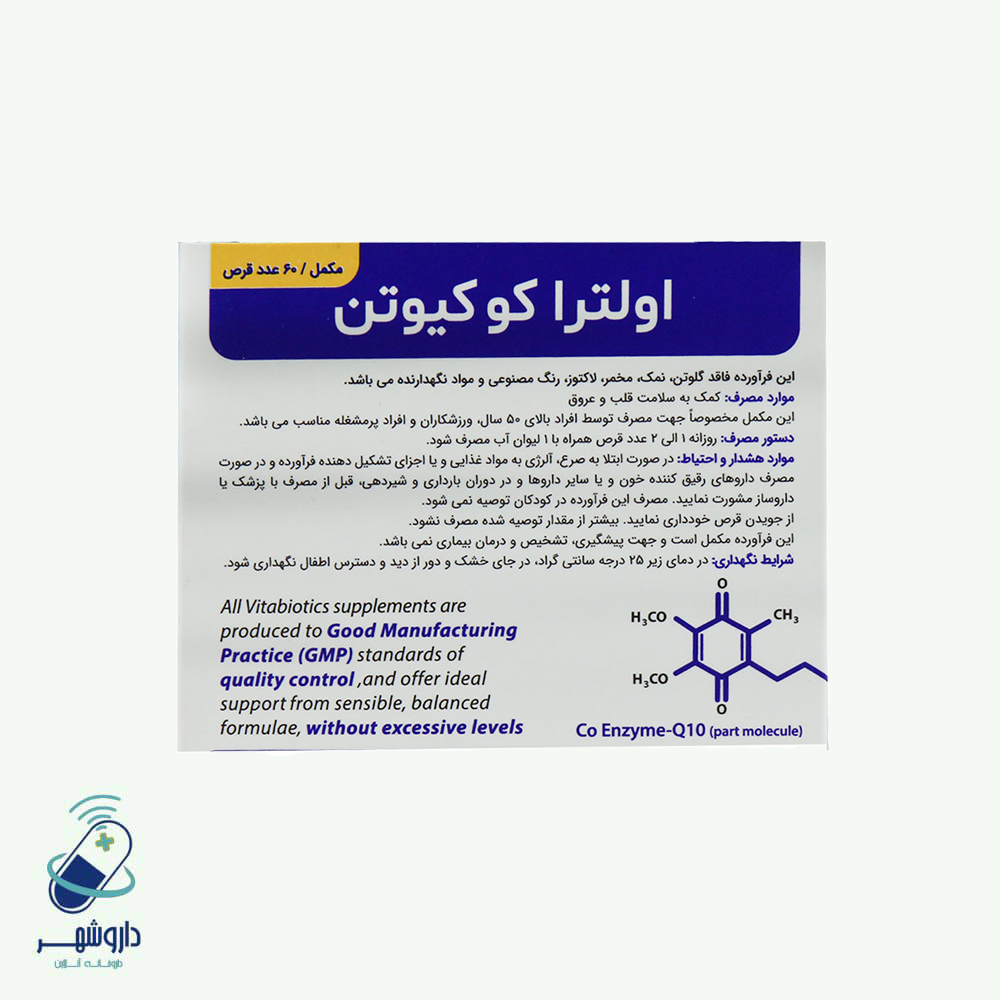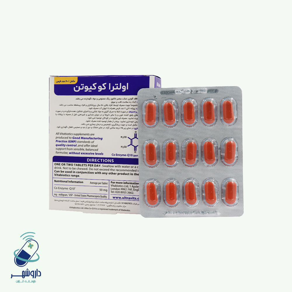 قرص Ultra Co Q10 ویتابیوتیکس 50 میلی گرم 60 عدد یک مکمل با ۵۰ میلیگرم کوآنزیم کوکیوتن در هر قرص است که برای ارتقاء سلامت قلب و عروق، افزایش سطح انرژی، کاهش خستگی و حفظ سلامت پوست مفید میباشد. این مکمل به کمک خواص آنتیاکسیدانی خود، به محافظت از سلولها در برابر استرس اکسیداتیو کمک میکند. قرص Ultra Co Q10 ویتابیوتیکس 50 میلی گرم 60 عدد تحت لیسانس شرکت معتبر ویتابیوتیکس در انگلستان تولید و در ایران عرضه میشود، لذا میتوانید اطمینان حاصل کنید که این محصول از کیفیت بالایی برخوردار است. با مصرف مکملهای مشابه مانند قرص امگا ۳ همراه این محصول، میتوانید تأثیرات مثبتی در بهبود سلامت قلب و عروق مشاهده کنید.
